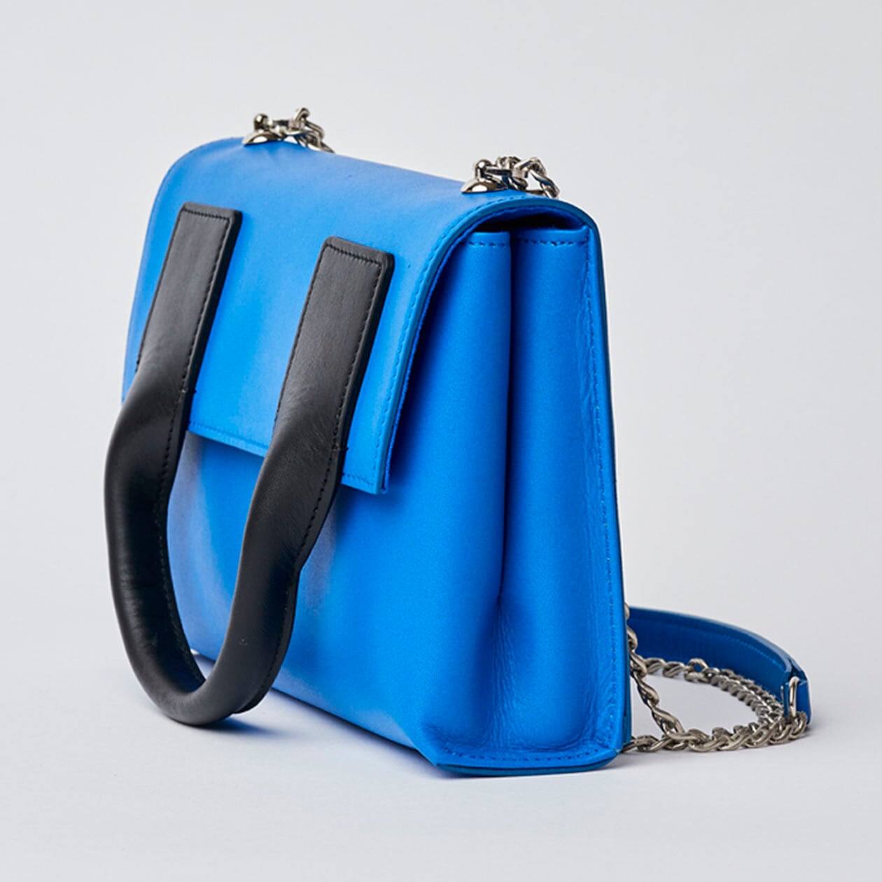 Crossbody bag “Paddle” with an accented handle attached to the flap facing down.